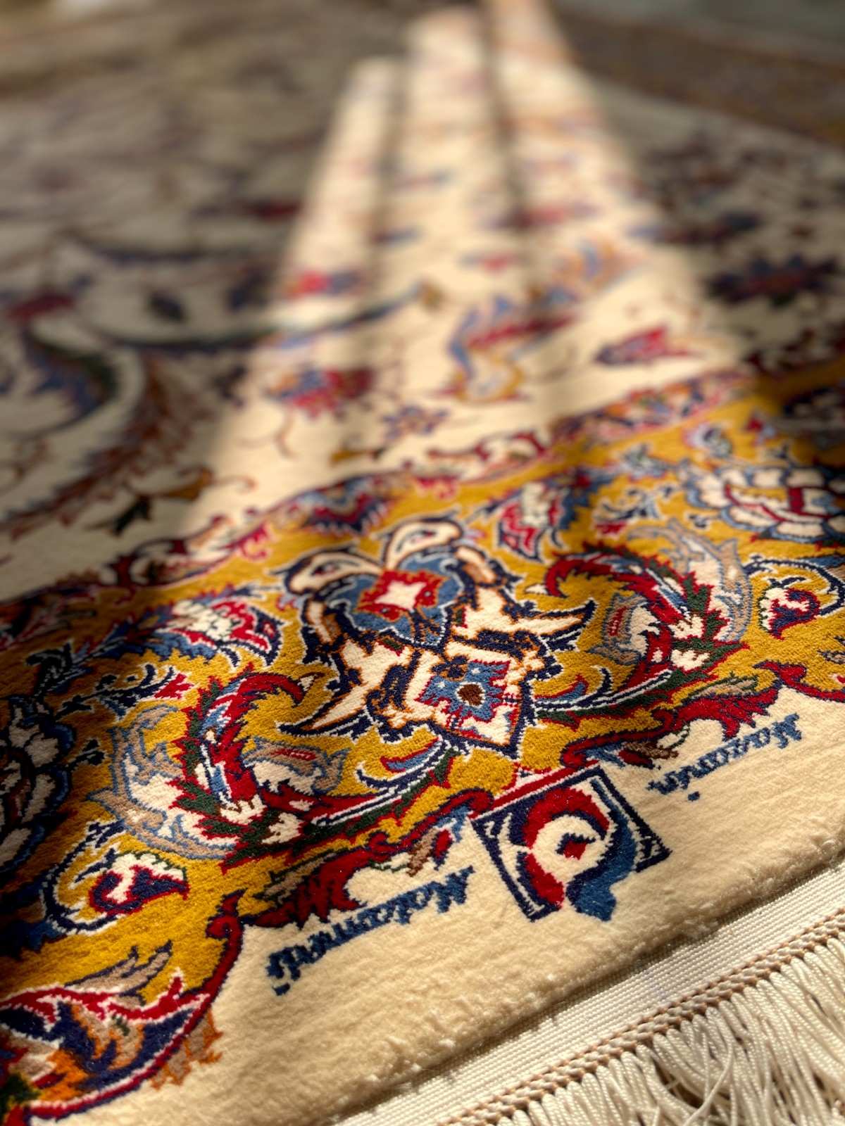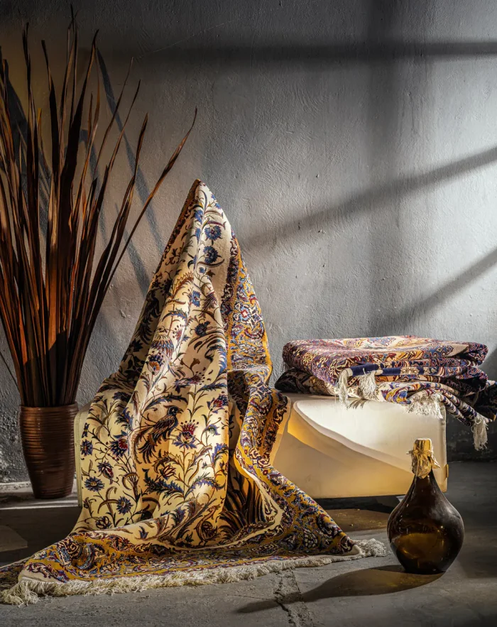The border of the carpet, with its golden motifs and rich details, signifies respect and appreciation for the art and culture that we see in this carpet, and this border acts as a guardian that gives credibility to the beauty and stories of the carpet.
