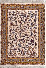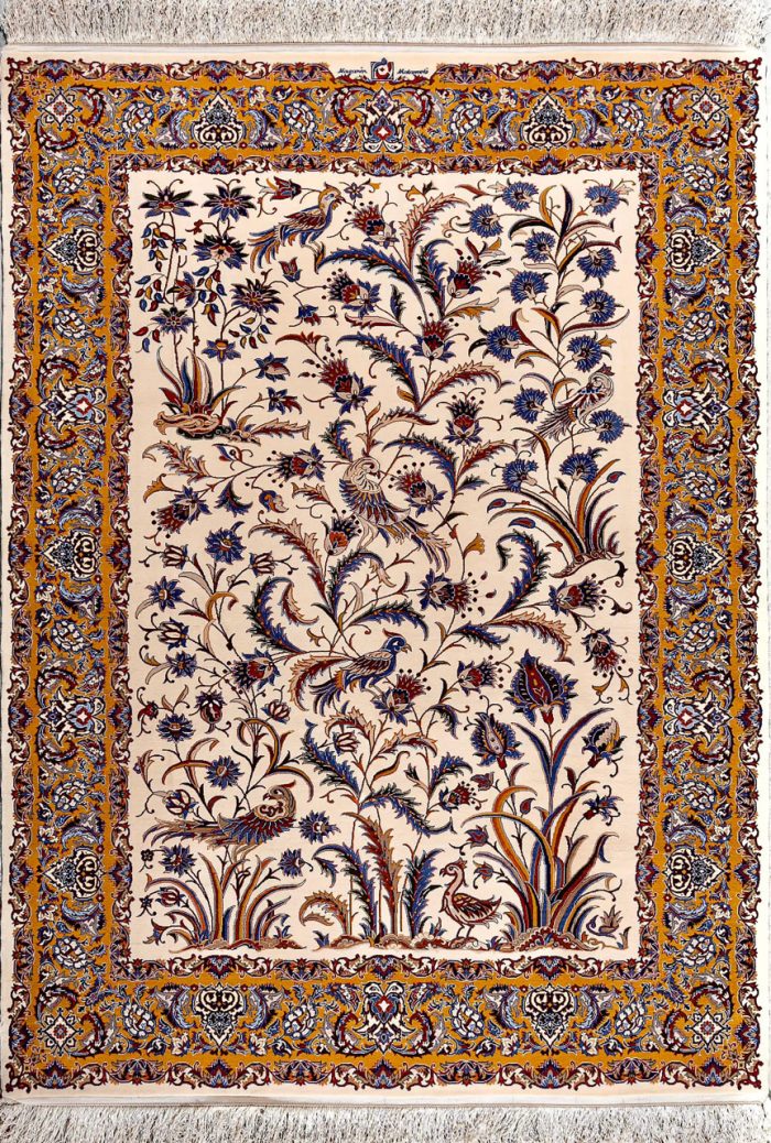 In this carpet, elements such as birds and lotus flower bushes recreate a symbol of life and love for life; the story of the flower and the nightingale has been a story of lovers in Iranian art since ancient times, and in this carpet, the loving nightingale is busy protecting his beloved, who here is the *lotus flower*.